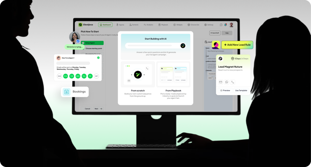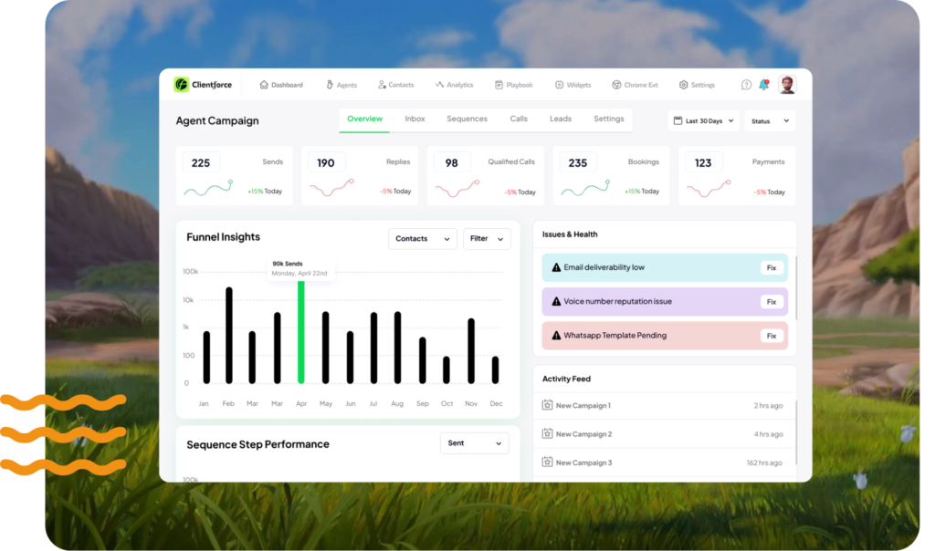 ClientForce is an AI Sales Agents platform. Setup an Agent once for a set goal and it finds leads, runs outreach, follow up, and even generates proposals — with full compliance, deliverability, and analytics built in. All end to end.